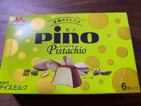 定番アイス「ピノ(PINO)」からピスタチオ味が発売。表面のトッピングですが、ピスタチオそのものかと思ったら、パッケージの裏には、「ピスタチオ風···
